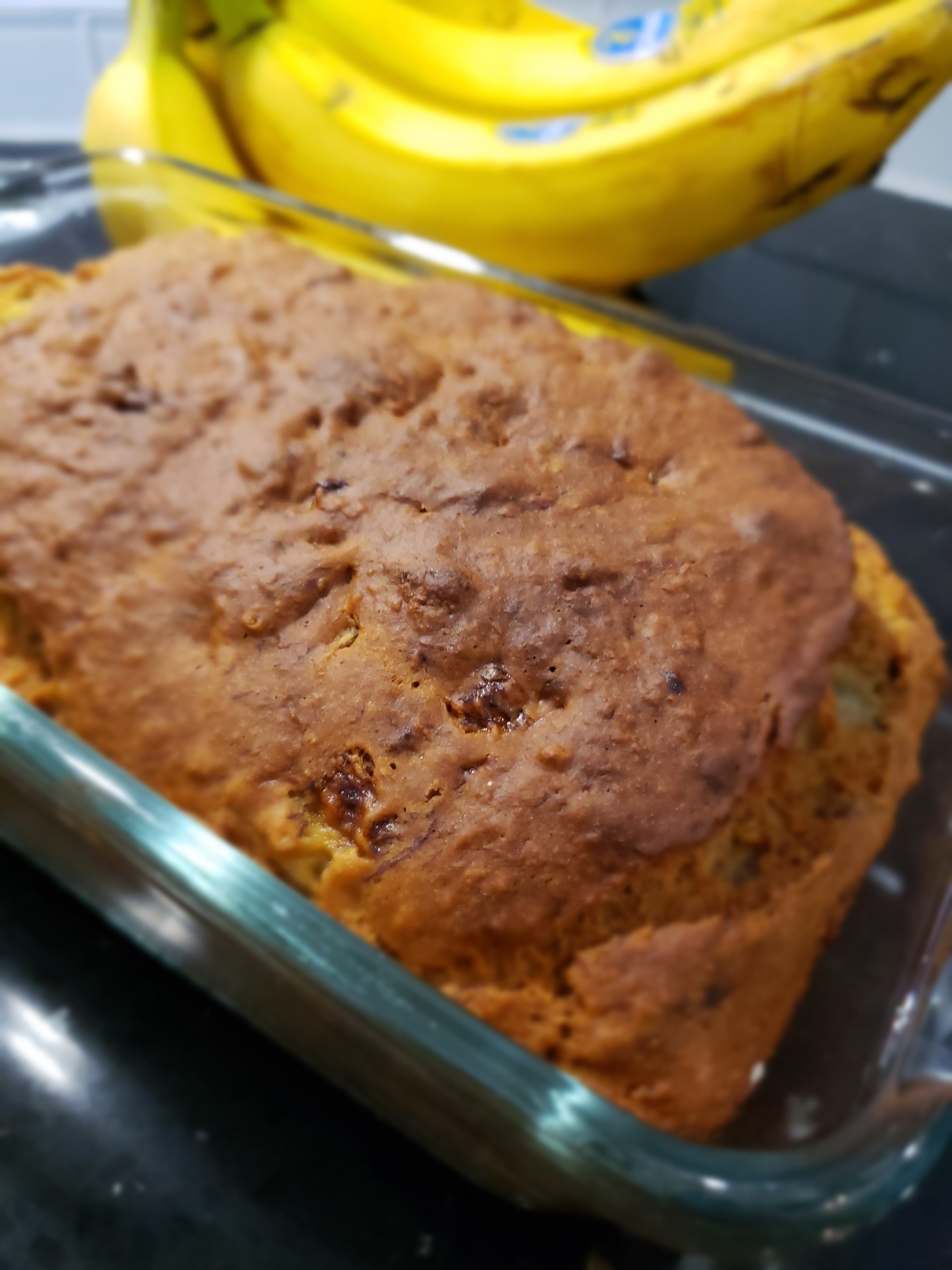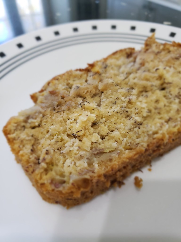 Mash ripe bananas, once well mashed add sugar and applesauce until combined. Add remaining ingredients and mix well. Pour into greased pan and bake for 50-55 minutes until toothpick comes out clean.